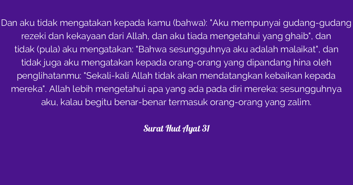 Qur'an wiki is a repository for the best available data for every surah and ayat. Read surah hud ayat 31 11:31 with translation. We hope to make it easy for everyone to read, study, and learn the noble quran. Quran surat hud ayat 31. وَلَآ أَقُولُ لَكُمْ عِندِى خَزَآئِنُ ٱللَّهِ وَلَآ أَعْلَمُ ٱلْغَيْبَ وَلَآ أَقُولُ إِنِّى مَلَكٌ وَلَآ أَقُولُ لِلَّذِينَ تَزْدَرِىٓ أَعْيُنُكُمْ لَن يُؤْتِيَهُمُ ٱللَّهُ خَيْرًا ۖ ٱللَّهُ.